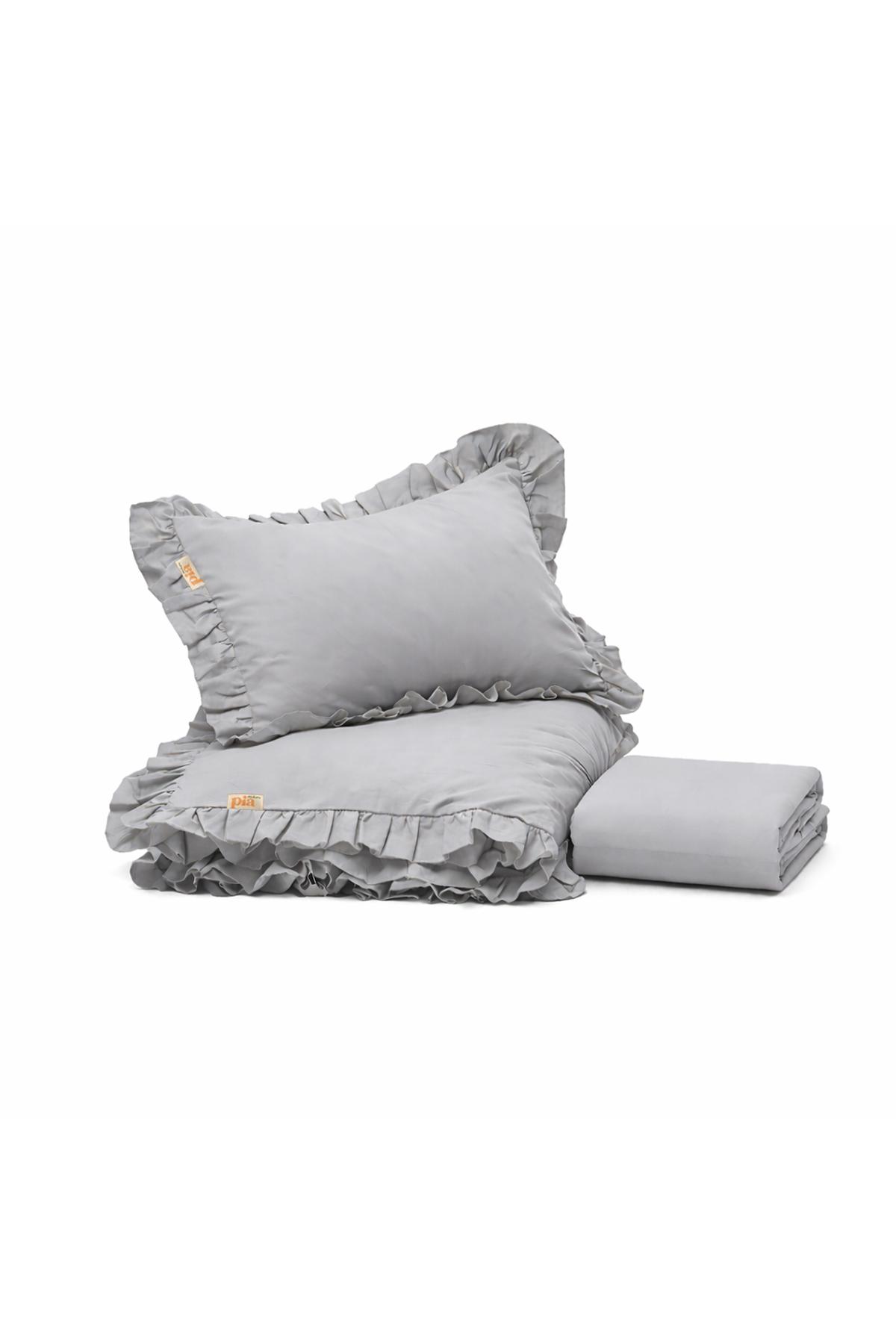 %100 Pamuk Farbalalı / Fırfırlı Nevresim Takımı Gri
