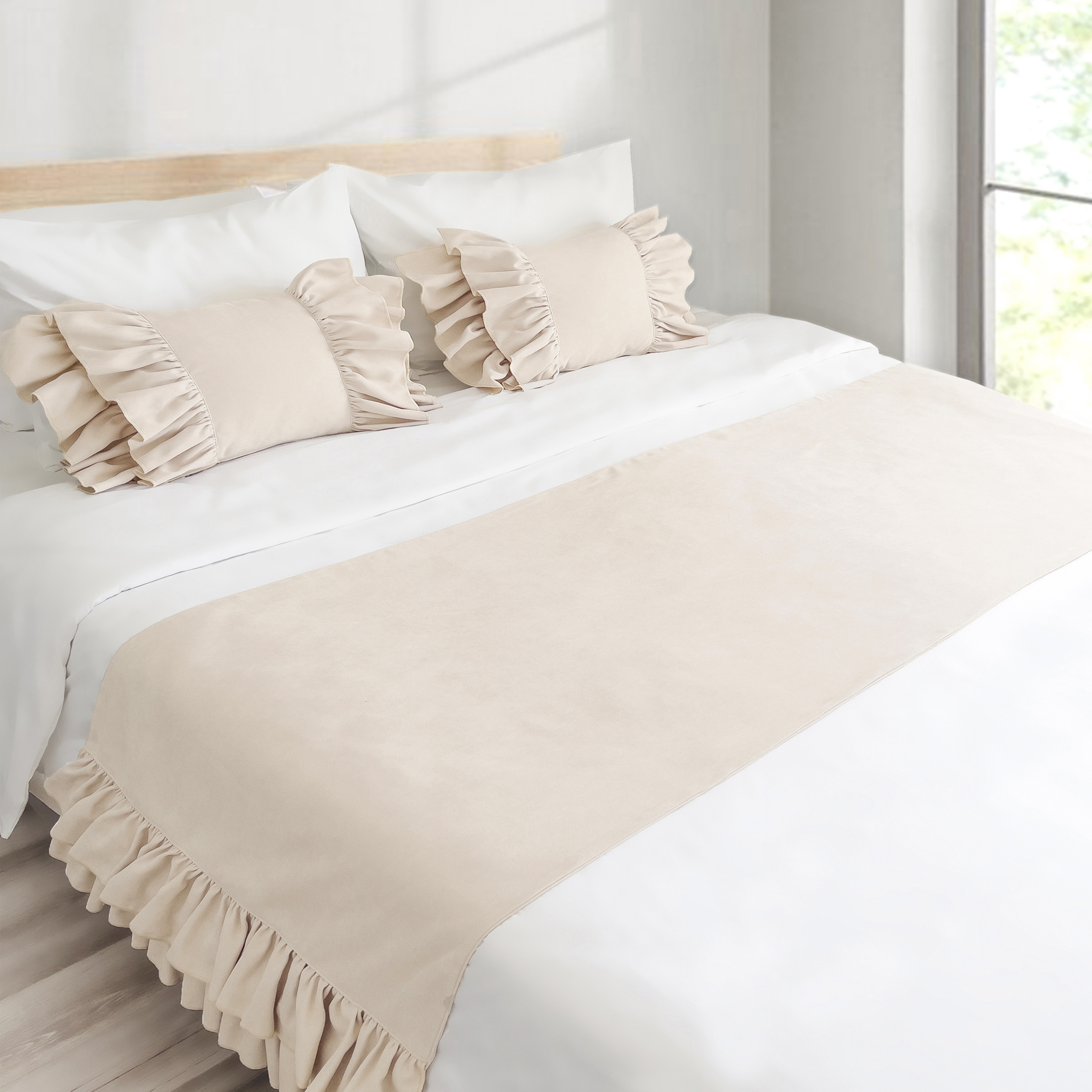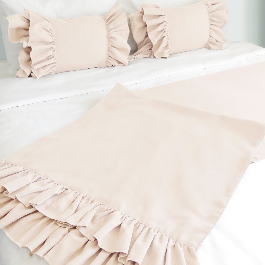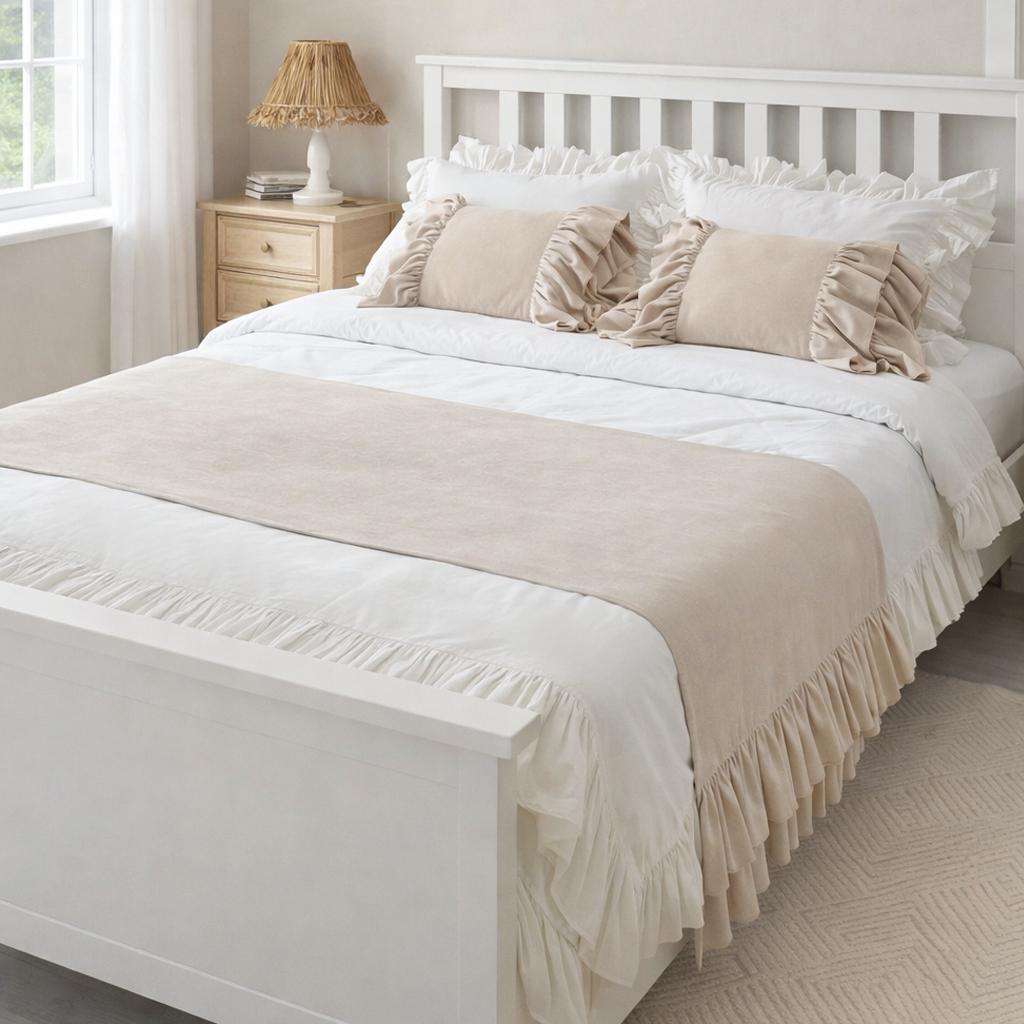 Yatak runner çift kişilik 70x240 cm ölçüsündedir. Fırfır detayları vardır.