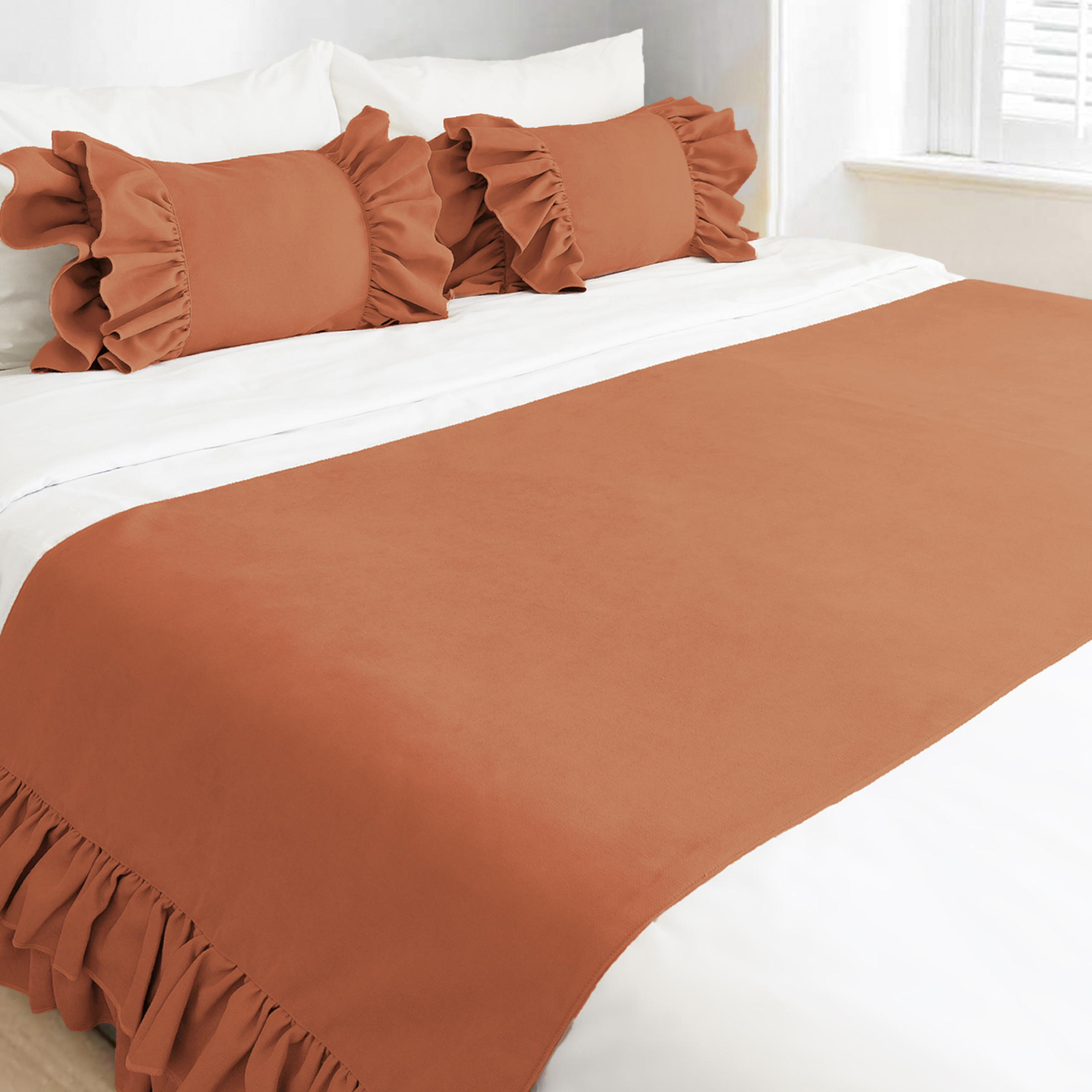 Yatak runner çift kişilik 70x240 cm ölçüsündedir. Fırfır detayları vardır.