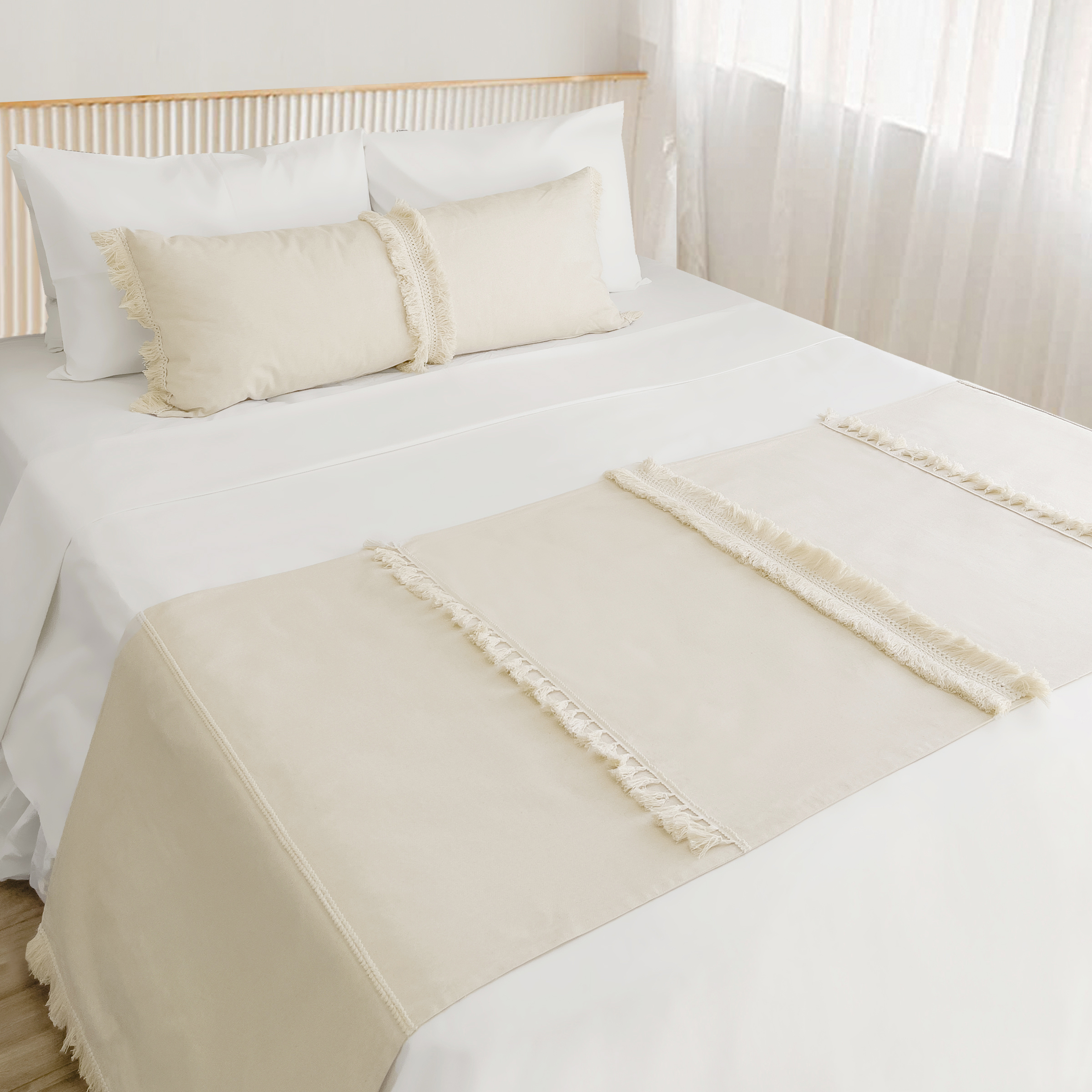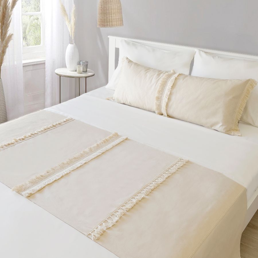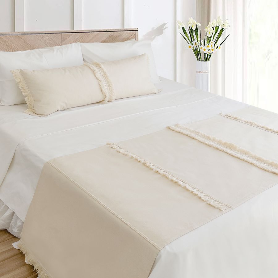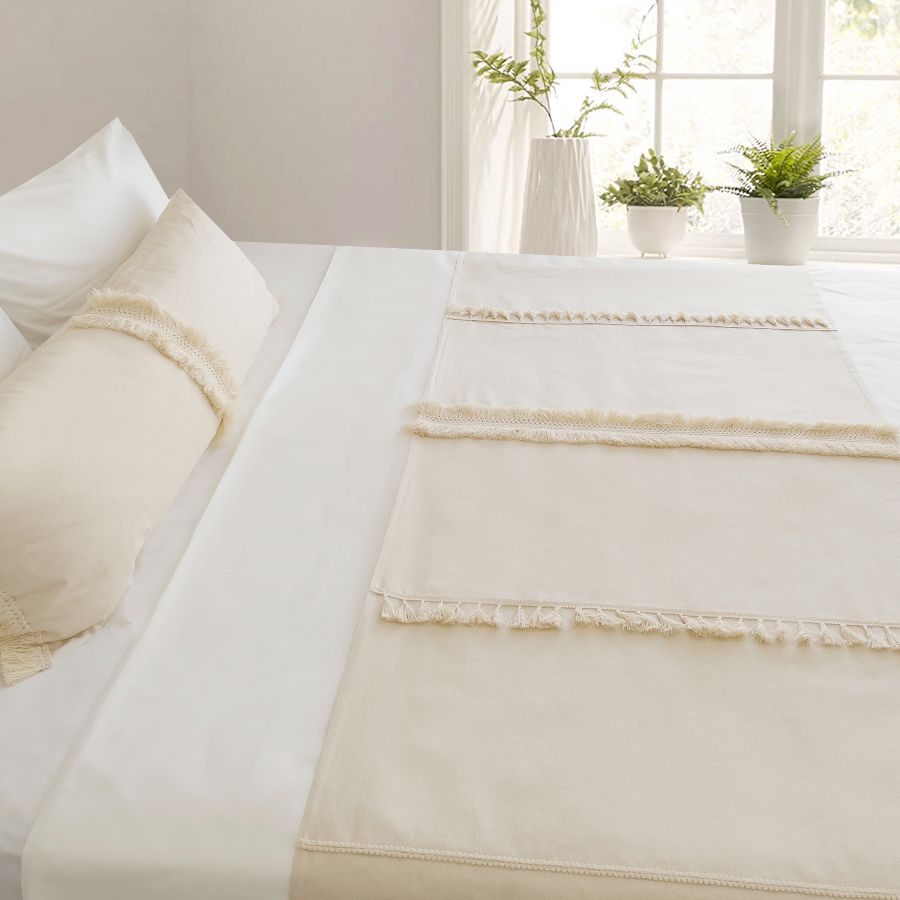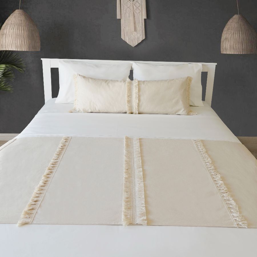 Yatak runner çift kişilik 80x240 cm ölçüsündedir. Püskül detayları vardır.